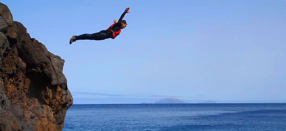 O coasteering combina rappel, escalada e saltos para o mar numa única atividade que lhe permite conhecer as escarpas sobre as baías as grutas e os recantos com água translúcida, existentes na Ilha.