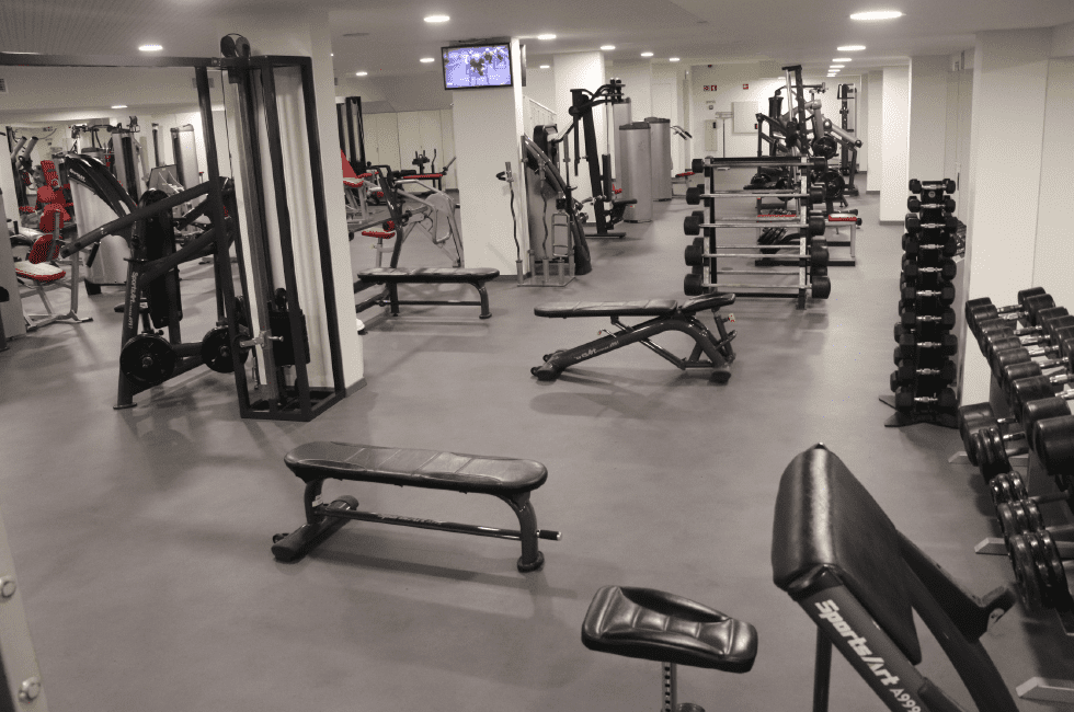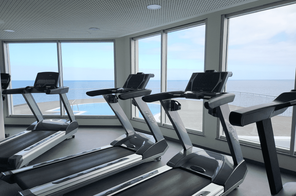 Uma vasta sala de atividades em grupo, uma sala de musculação com diversos aparelhos profissionais e um espaço dedicado ao Cardiofitness com vista para o mar.
